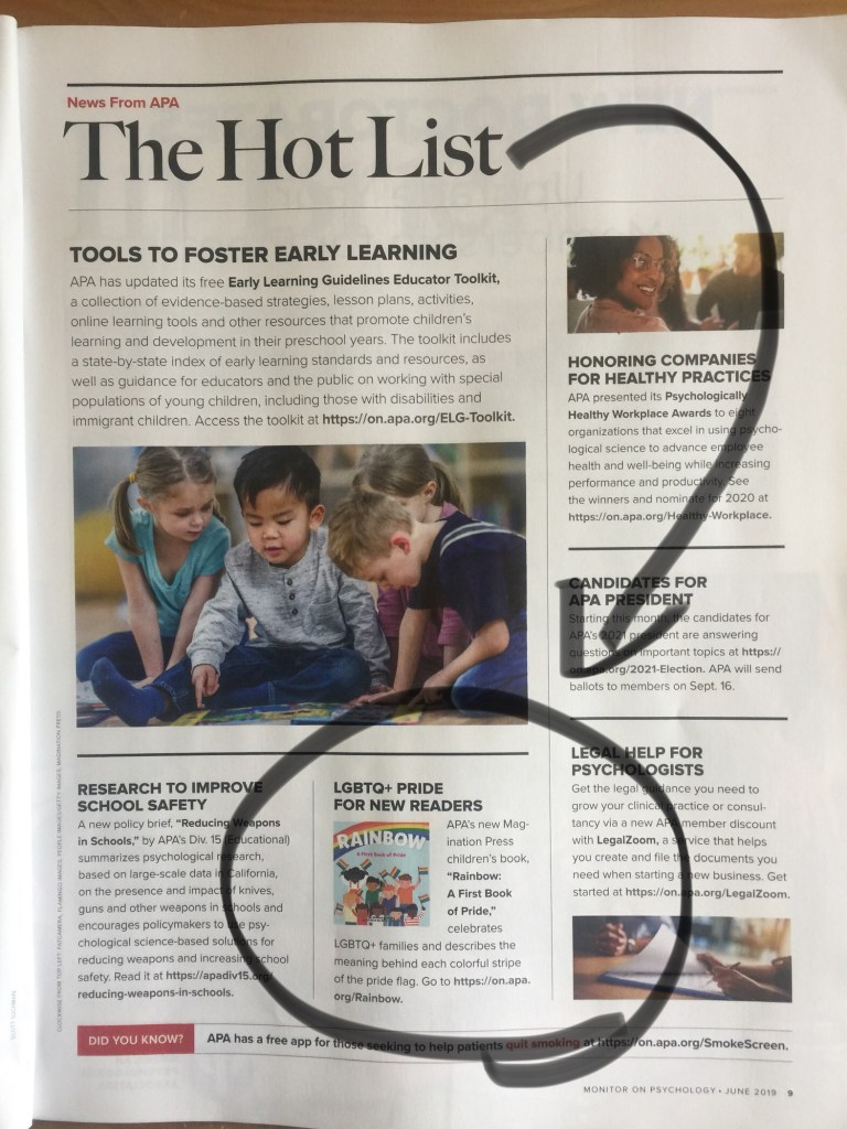 Another Magination Press banned book, This Day in June by Gayle Pitman, PhD, APA’s first children’s book featuring sexual orientation and gender diversity, appeared on the ALA Top 11 Most Challenged Books list in 2018. Pitman’s groundbreaking book “created a pathway for other LGBTQ+ books for kids that are positive, joyful, and celebratory,” said Michael Genhart, PhD, a clinical psychologist who counts it among his favorite banned books. Genhart has published two LGBTQ+ themed picture books of his own with Magination Press that find themselves targeted, including Rainbow: A First Book of Pride. His hope is that this year’s surge in book banning leads to something more constructive. “Controversy invites conversation,” said Genhart. “So, despite being very troubled by banned lists, my hope is that when any of my books ends up on them what happens is productive dialogue, incrementally moving the needle forward toward equity and inclusion.”