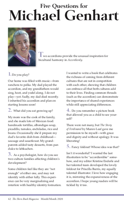 I think most people would not know of my mixed ethnic heritage: Mexican/Swiss – American. Unusual blend, right? There’s so much I love about both these cultures! In fact, I have a picture book coming out in 2020 called ACCORDIONLY (Magination Press) which features a boy who brings together the two cultures of his family through the music of the accordion. Super cute!
